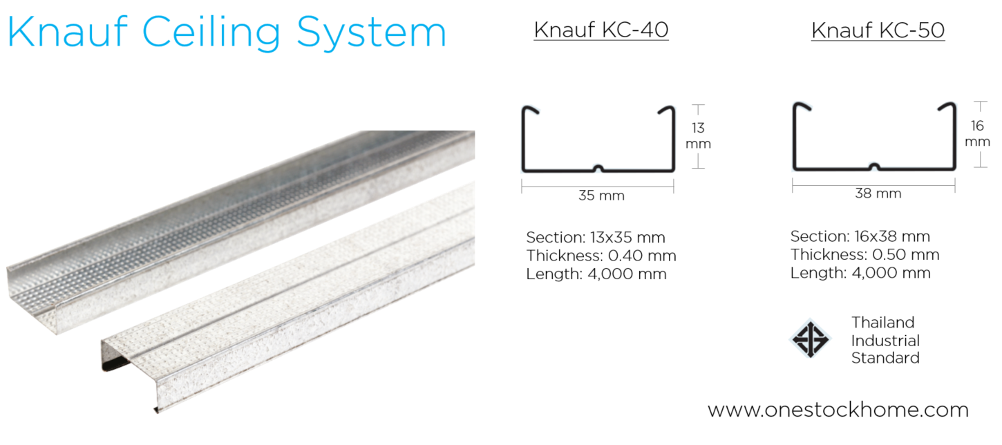 Knauf Ceiling System has 2 key systems of which one passed Thailand Industrial Standard. KC-50 Knauf is thicker in its steel and the stick is coated with galvanized. The section of KC50 is slightly larger than that of KC40 system.