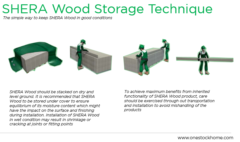 - SHERA Wood should be stacked on dry and level ground. It is recommended that SHERA Wood to be stored under cover to ensure equilibrium of its moisture content which might have the impact on the surface and finishing during installation. Installation of SHERA Wood in wet condition may result in shrinkage or cracking at joints or fitting points