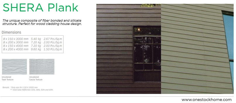 SHERA plank can withstand simple handling and installation and is therefore suitable for even Do-lt-Yourself (DIY) segment. It comes in several sizes and textures with a real remedy to wood-cladding houses which are severely affected by termites and humidity. Uncolored Teak Texture Uncolored Cassia Texture SHERA plank is a unique composite of natural fibr structure. This autoclaved wood grain siding acq flexible and dimensionally stable. lt is a cellulos NON asbestos fibre. SHERA plank can withstand therefore suitable for even Do-lt-Yourself (DIY).