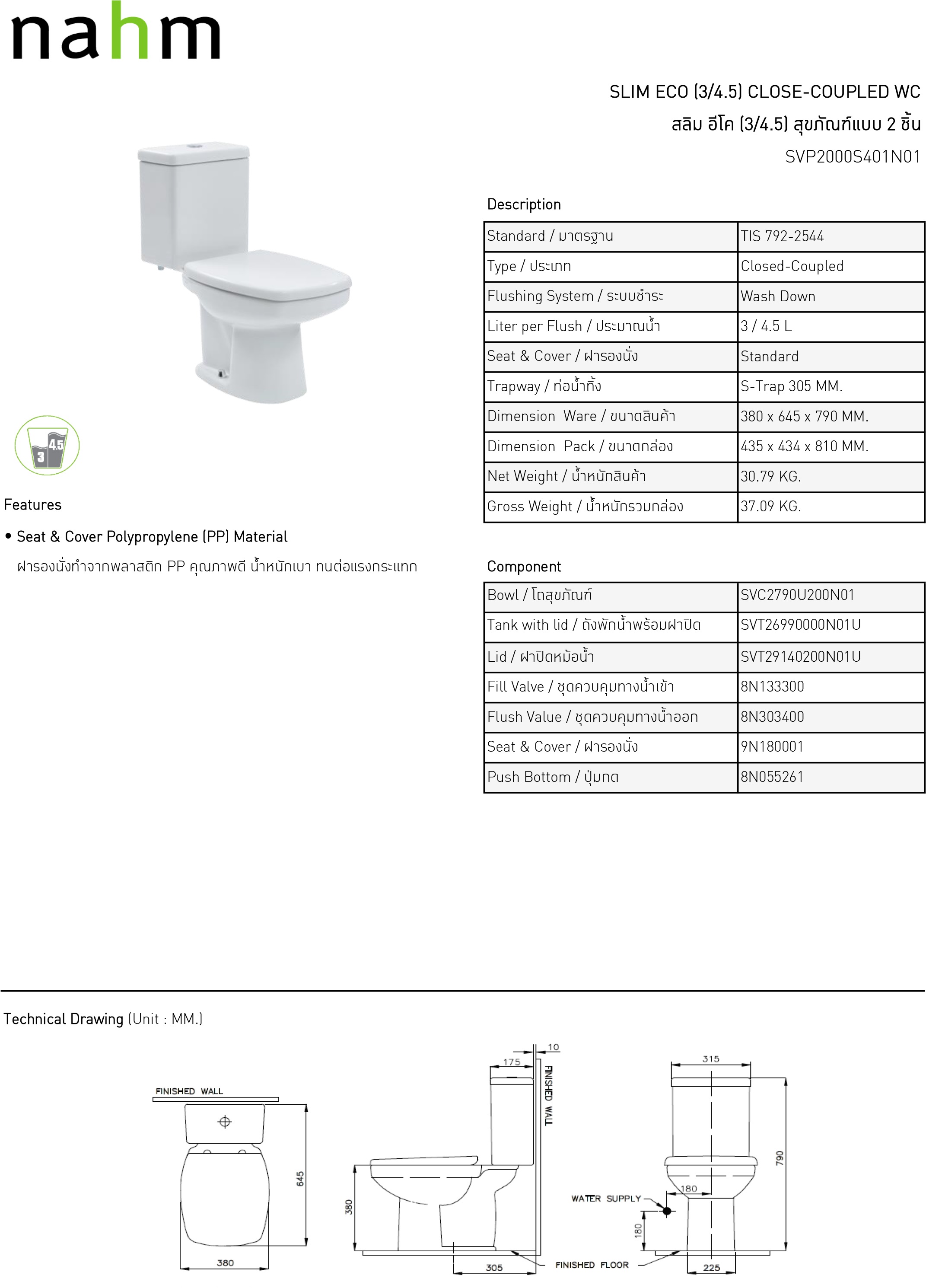 Two-piece toilet Nahm SVP2000S401N01 Slim Eco model 3/4.5 liters