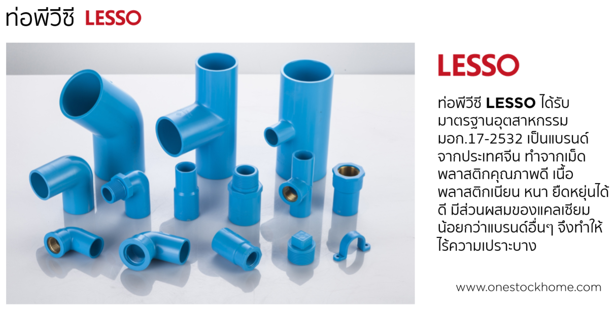 ท่อพีวีซี ท่อพีวีซี LESSO ได้รับมาตรฐานอุตสาหกรรม มอก.17-2532 เป็นแบรนด์จากประเทศจีน ทำจากเม็ดพลาสติกคุณภาพดี เนื้อพลาสติกเนียน หนา ยืดหยุ่นได้ดี มีส่วนผสมของแคลเซียมน้อยกว่าแบรนด์อื่นๆ จึงทำให้ไร้ความเปราะบาง