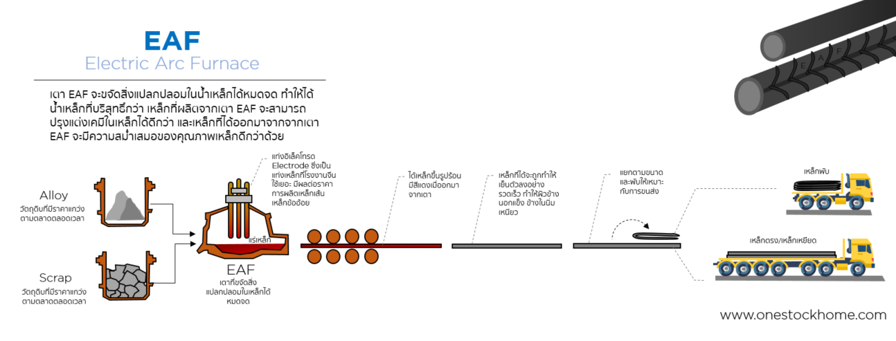 เหล็ก EAF เป็นเหล็กที่ผลิตในประเทศ โดยปัจจัยการผลิต และต้นทุนการผลิตที่สำคัญหลักๆ มาจากวัตถุดิบเหล็ก และแท่งอิเล็คโทรด ที่เป็นส่วนสำคัญของเตาหลอมเหล็ก ข้อดี