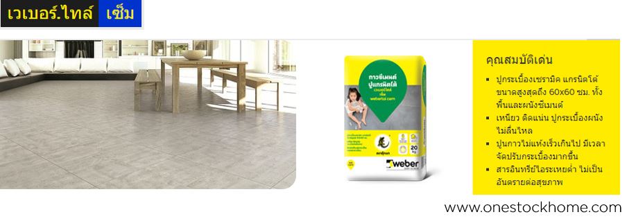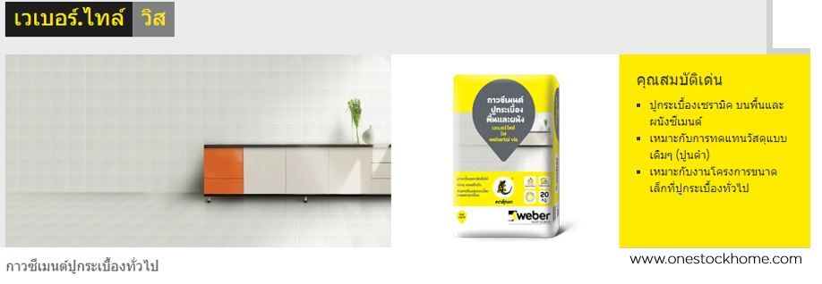 เวเบอร์ ไทล์ วิส Weber.tai Vis ตราตุ๊กแก จุดเด่น เวเบอร์ ไทล์ วิซ ตราตุ๊กแก มีช่วงเวลาที่ใช้กาวซีเมนต์หลังผสมน้ำที่เหมาะสม ทำให้มีระยะเวลาปาดกาวซีเมนต์ได้นานขึ้น (เก็บให้ห่างจากแสงแดด) พื้นผิวสามารถสัญจรได้หลังทิ้งไว้้ 24...