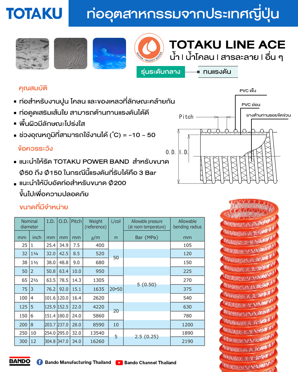 ท่อยาง ท่อลำเลียงน้ำ ท่อส่งน้ำ ท่อดูดน้ำ TOTAKU LINE ACE เหมาะสำหรับงานส่งและงานดูด น้ำ น้ำโคลน สารละลาย
