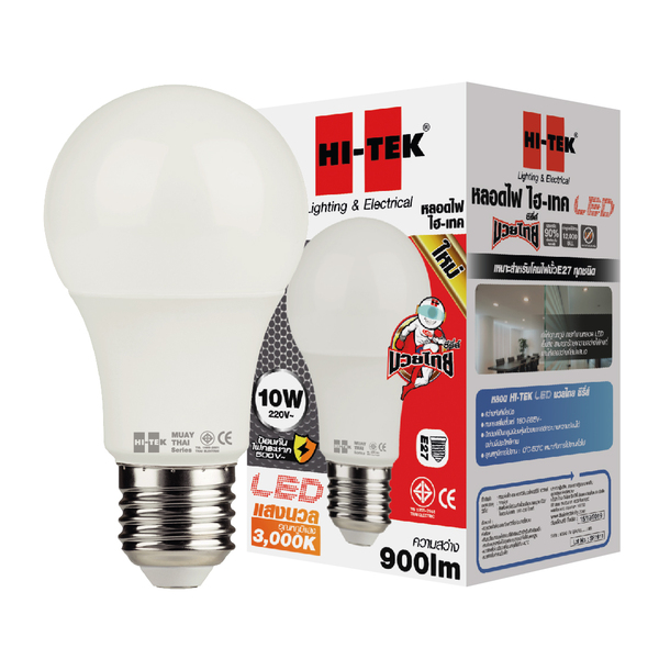 หลอดไฟ LED E27 10 วัตต์ วอร์มไวท์ ทรงลูกแพร์ HI-TEK มวยไทย