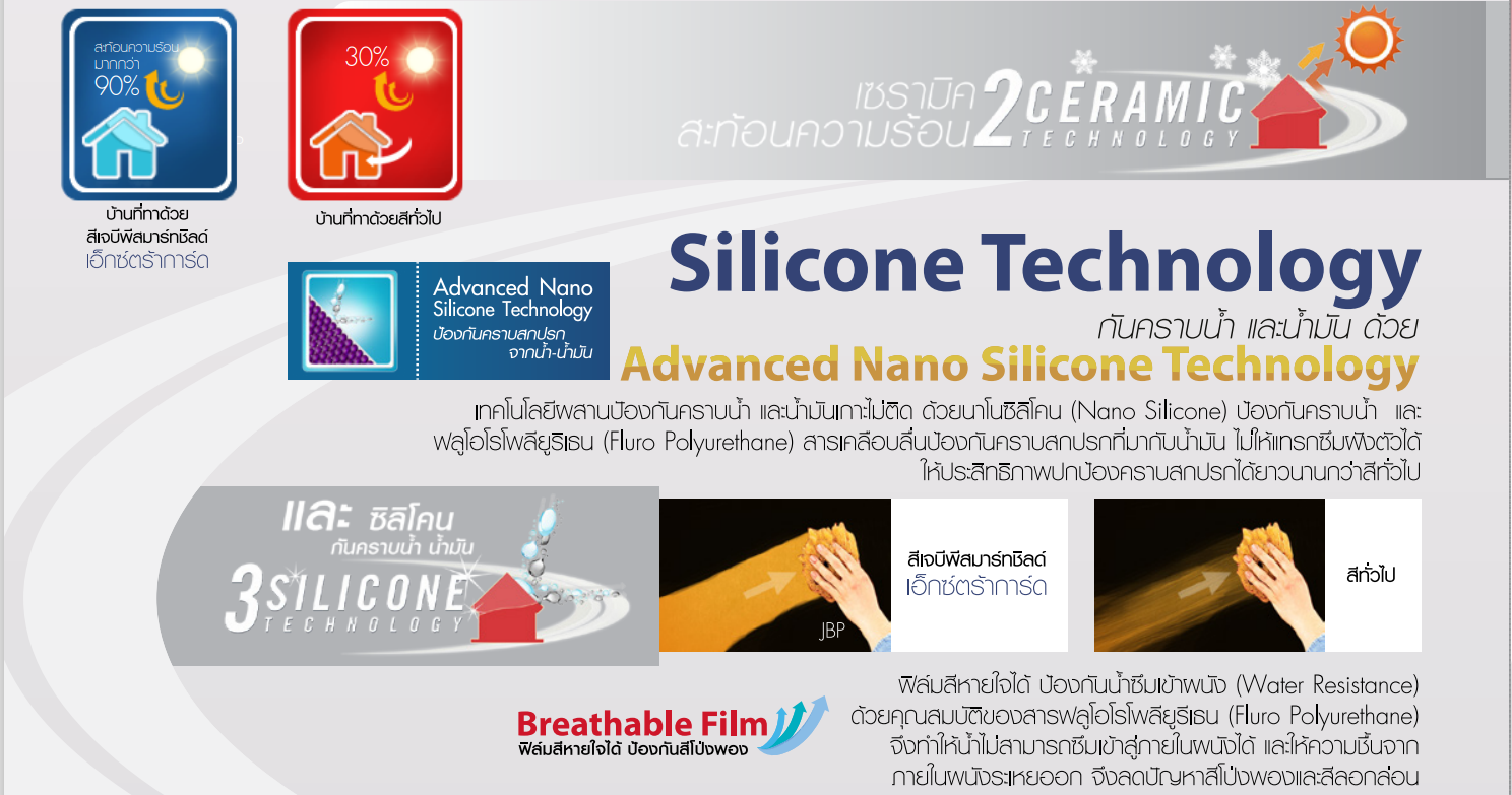 สีน้ำอะครีลิคเจบีพีสมาร์ทชิลด์เอ็กซ์ตร้าการ์ด เป็นสีหนึ่งเดียวที่รวมเทคโนโลยีผสมอนุภาคที่เป็นฉนวนไมโครเฟียร์เซรามิก ที่ช่วยสะท้อนรังสี UV ทำให้บ้านของคุณไม่ร้อน ซึ่งเทคโนโลยีนี้ช่วยสะท้อนพลังงานความร้อนจากแสงอาทิตย์ได้มากกว่า 90% มากกว่าสีทั่วไปถึง 3 เท่า ซึ่งทำให้บ้านคุณเย็นกว่าบ้านทั่วไปในช่วงกลางวันที่แสงแดดแรงจัดจะช่วยลดความร้อนบนพื้นผิวได้ถึง 12 องศาเซลเซียส