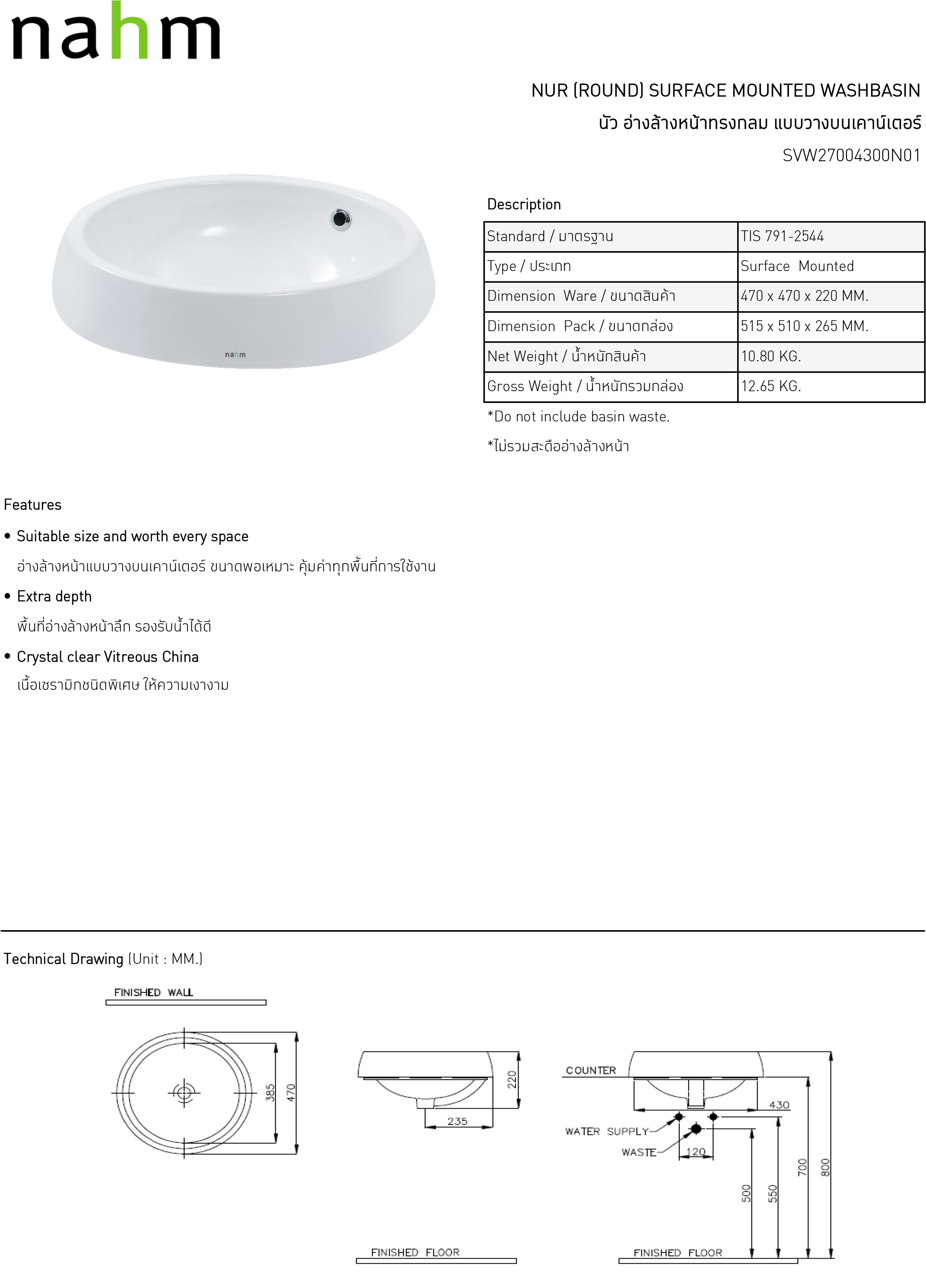 อ่างล้างหน้าแบบฝังบนเคาน์เตอร์ ทรงกลม Nahm SVW27004300N01 รุ่นนัว