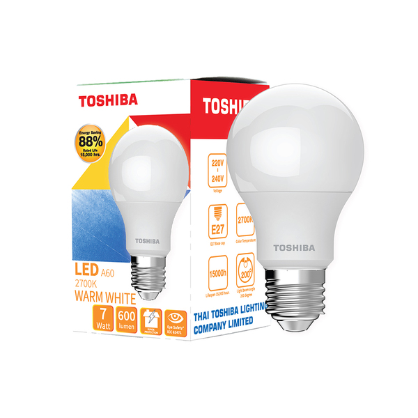 หลอดไฟ LED E27 7 วัตต์ วอร์มไวท์ ทรงลูกแพร์ TOSHIBA A60 G7