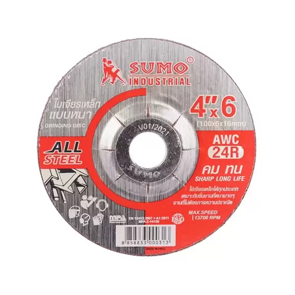 - ประสิทธิภาพการเจียรสูง: ใบเจียร SUMO AWC24R ใช้เม็ดทรายอลูมิเนียมออกไซด์คุณภาพสูง (AWC24R) ซึ่งให้ความคมและประสิทธิภาพในการขจัดเนื้อเหล็กได้อย่างรวดเร็ว