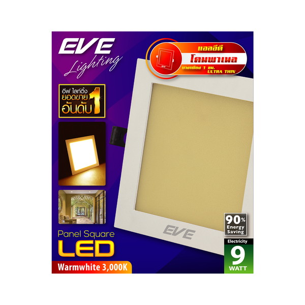 ดาวน์ไลท์ EVE PANEL SQUARE LED 9 วัตต์ WARMWHITE 4 นิ้ว เหลี่ยม สีขาว