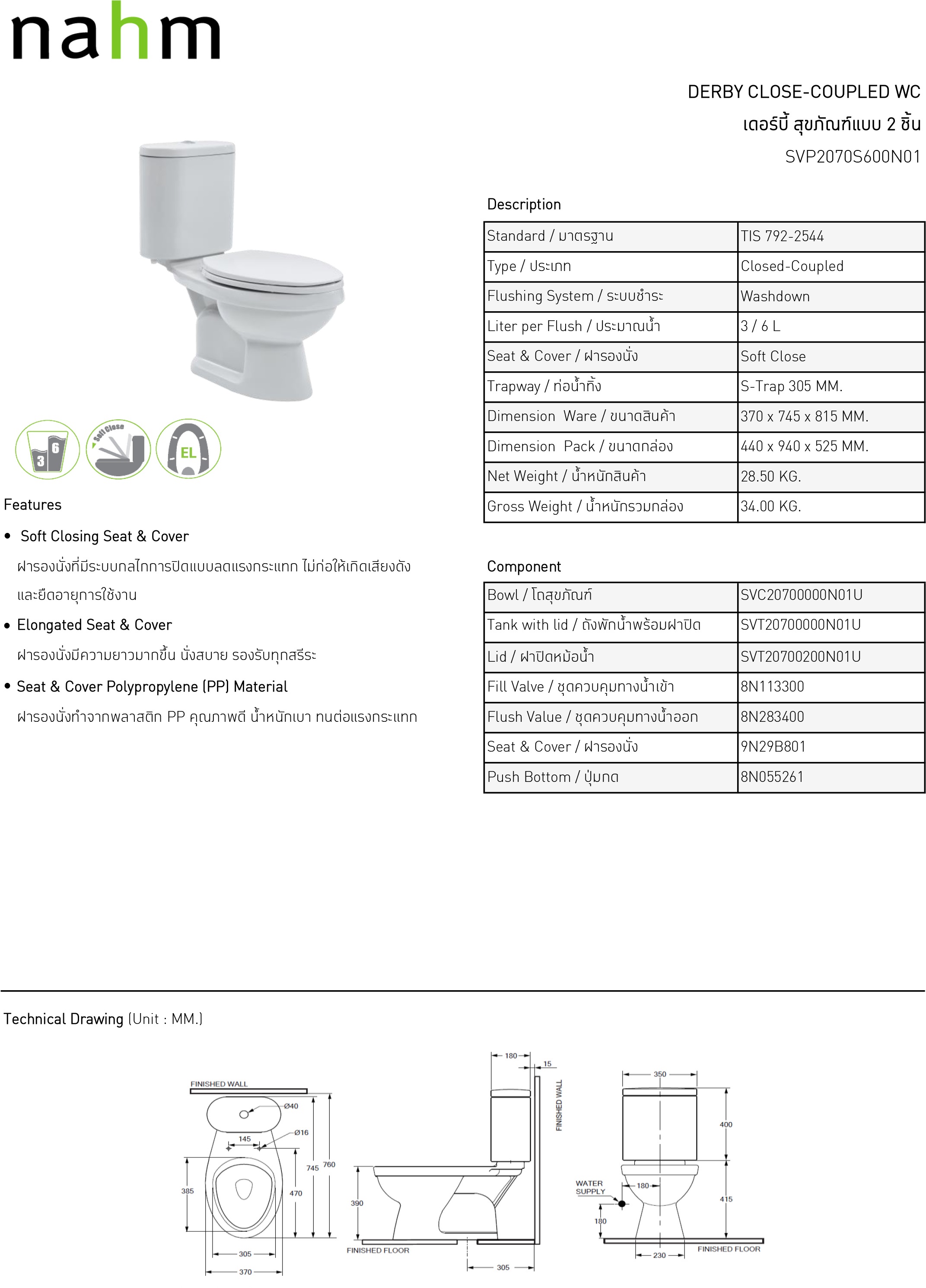 สุขภัณฑ์สองชิ้น Nahm SVP2070S602N01 รุ่นเดอร์บี้ 3/6 ลิตร