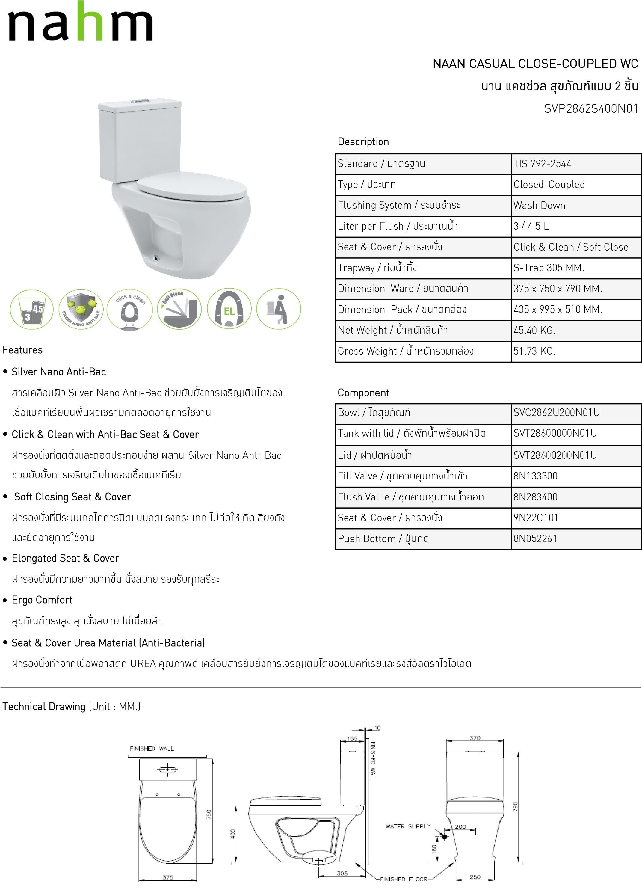 สุขภัณฑ์สองชิ้น Nahm SVP2862S400N01 รุ่นนาน แคชช่วล 3/4.5 ลิตร