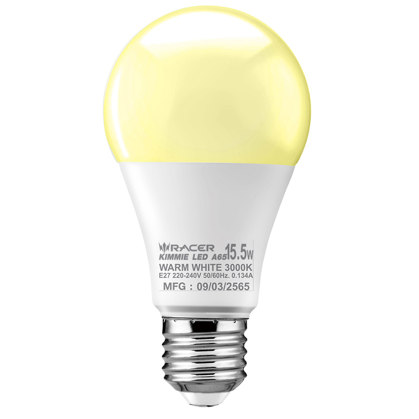 หลอดไฟ LED E27 15 วัตต์ วอร์มไวท์ ทรงลูกแพร์ RACER A65 KIMMIE