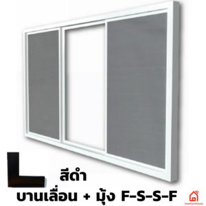 หน้าต่างกระจก UPVC Polywood บานเลื่อน+มุ้ง F-S-S-F สีดำ