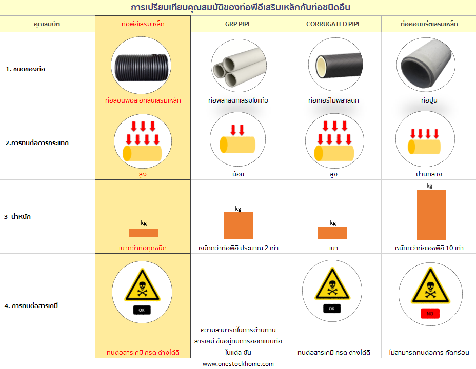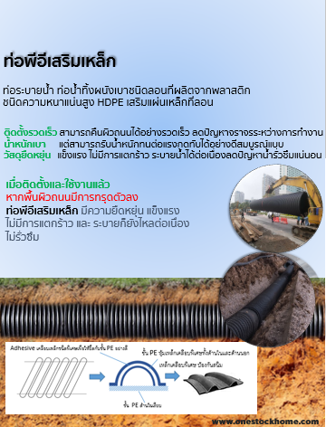 ท่อพีอีเสริมเหล็ก ท่อระบายน้ำ ท่อน้ำทิ้งผนังเบาชนิดลอนที่ผลิตจากพลาสติก ชนิดความหนาแน่นสูง HDPE เสริมแผ่นเหล็กที่ลอน ติดตั้งรวดเร็ว สามารถคืนผิวถนนได้อย่างรวดเร็ว ลดปัญหาจราจรระหว่างการทำงาน น้ำหนักเบา...