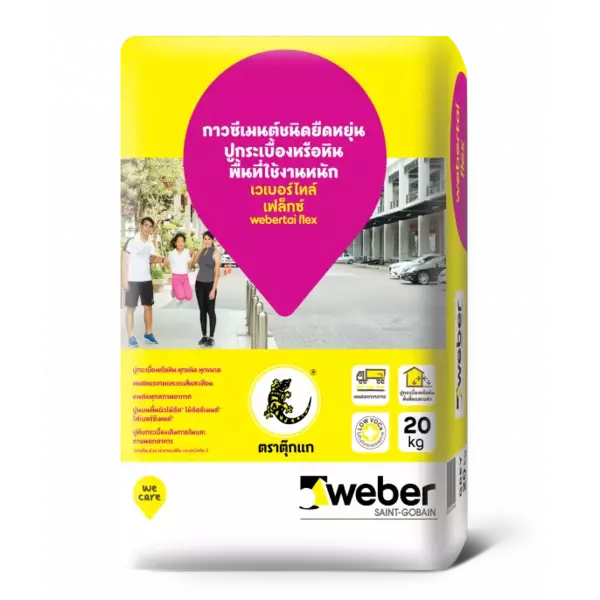 เวเบอร์.ไทล์ เฟล็กซ์ ตราตุ๊กแก Weber.tai Flex คุณสมบัติเด่น เวเบอร์.ไทล์ เฟล็กซ์ ตราตุ๊กแก Weber.tai Flex ยืดหยุ่น เหมาะกับพื้นผิวที่มีการแอ่นตัว ปูกระเบื้องขนาดใหญ่ กระเบื้องแกรนิตโต้ หินแกรนิต หินอ่อน ปูกระเบื้องบนอาคารสูง ...