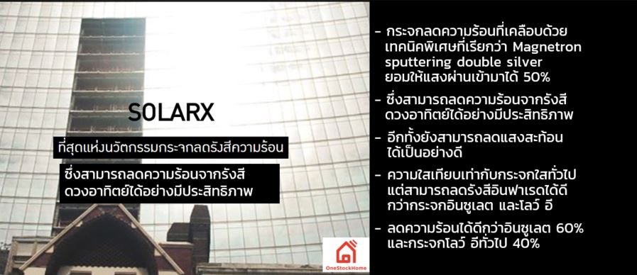 ความใสเทียบเท่ากับกระจกใสทั่วไป แต่สามารถลดรังสีอินฟาเรดได้ดีกว่ากระจกอินซูเลต และโลว์ อี (ลดความร้อนได้ดีกว่ากระจกอินซูเลต 60 เปอร์เซ็นต์ และกระจกโลว์ อีทั่วไป 40 เปอร์เซ็นต์) ลดความร้อนได้เทียบเท่ากระจกโลว์อีสองชั้น ความหนาเพียง 6 มิลลิเมตร จึงติดตั้งเข้ากับกรอบประตูและหน้าต่างเดิมได้โดยไม่จำเป็นต้องเปลี่ยนกรอบใหม่ สามารถใช้เครื่องมือสื่อสารและอุปกรณ์อิเล็กทรอนิกส์ได้ตามปกติ เนื่องจากกระจกSolar X ไม่ได้เคลือบด้วยโลหะ จึงไม่กีดขวางสัญญาณ