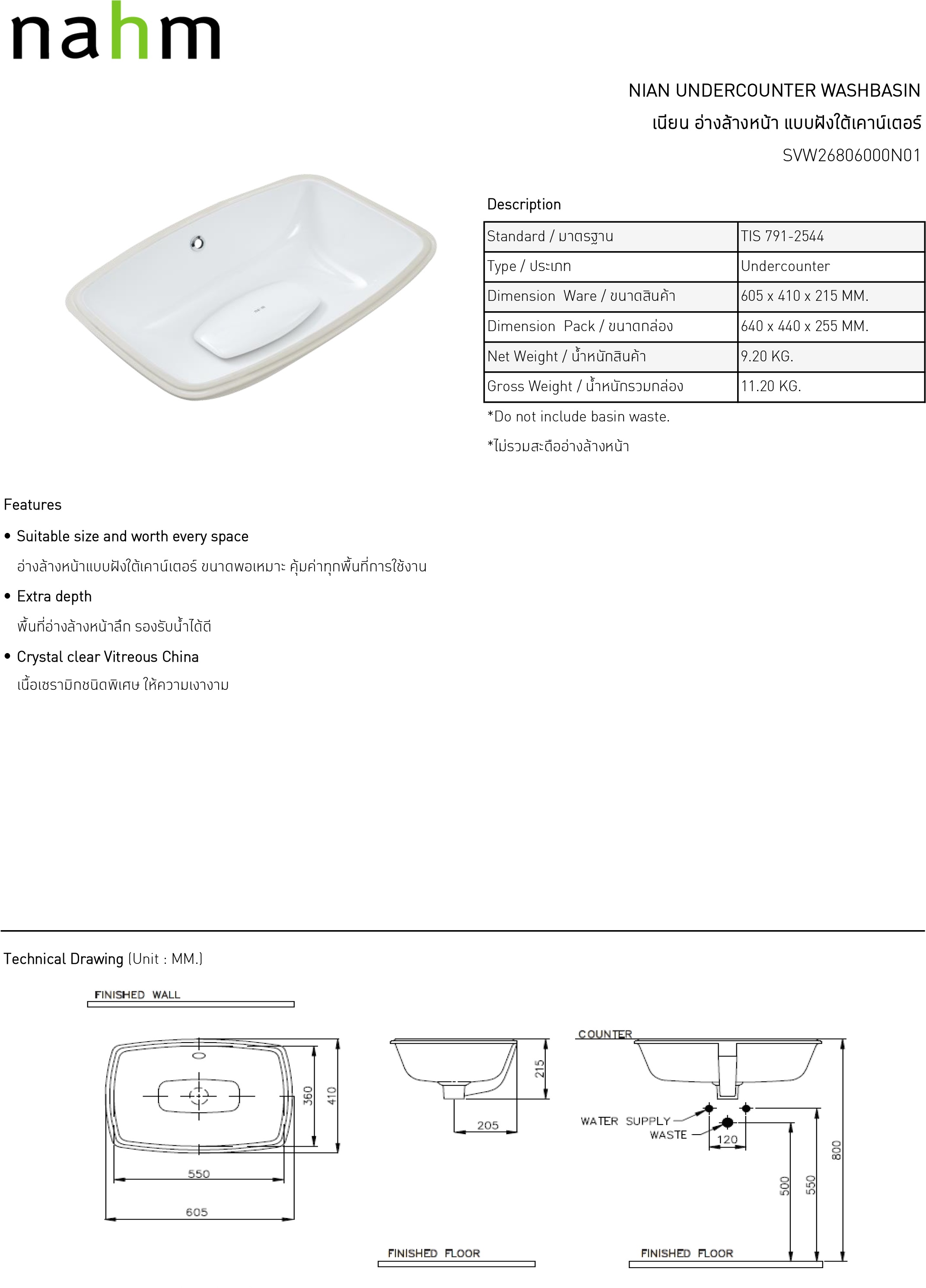 อ่างล้างหน้าแบบฝังใต้เคาน์เตอร์ Nahm SVW26806000N01 รุ่นเนียน