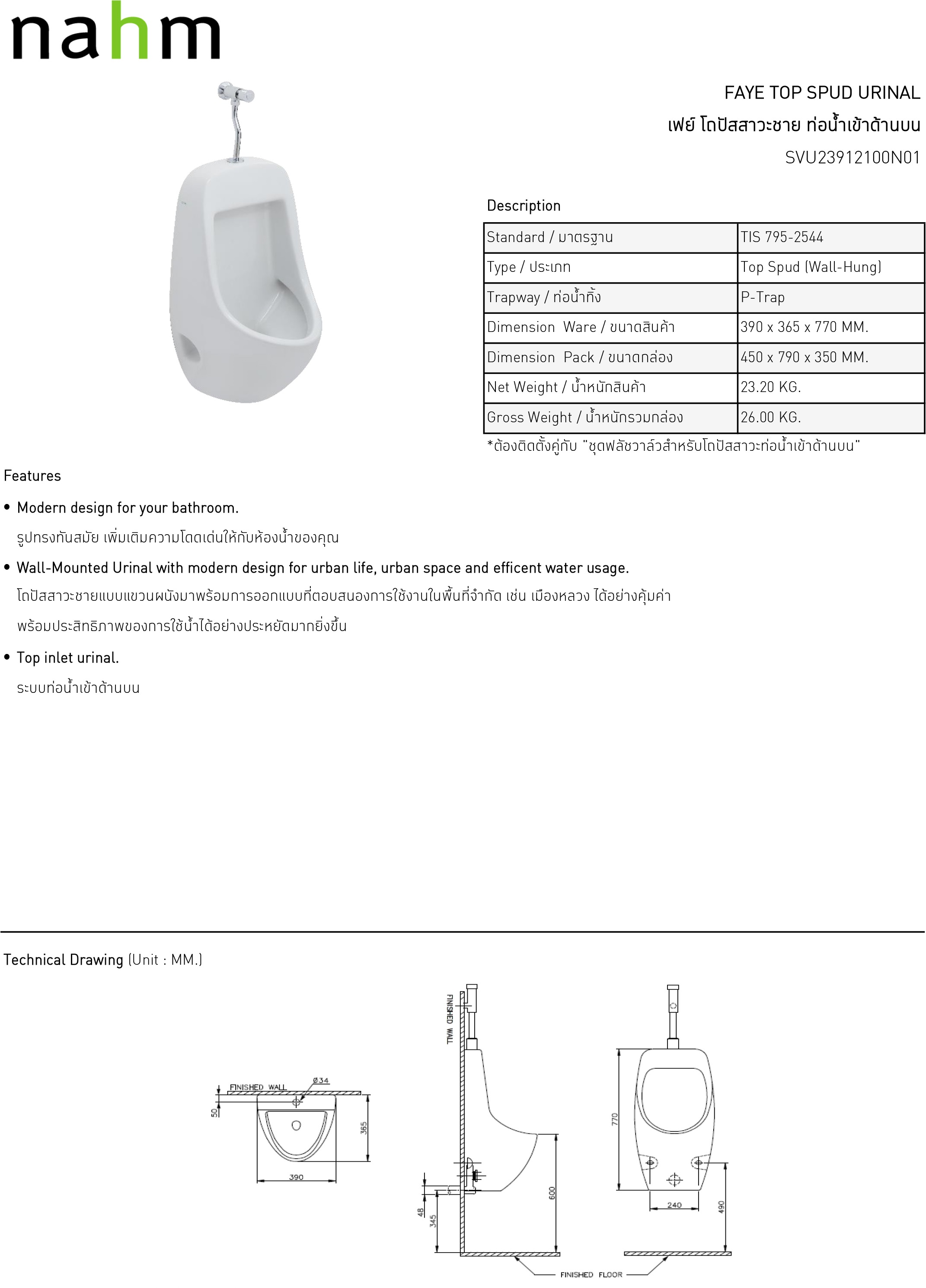โถปัสสาวะชาย Nahm SVU23912100N01 รุ่นเฟย์