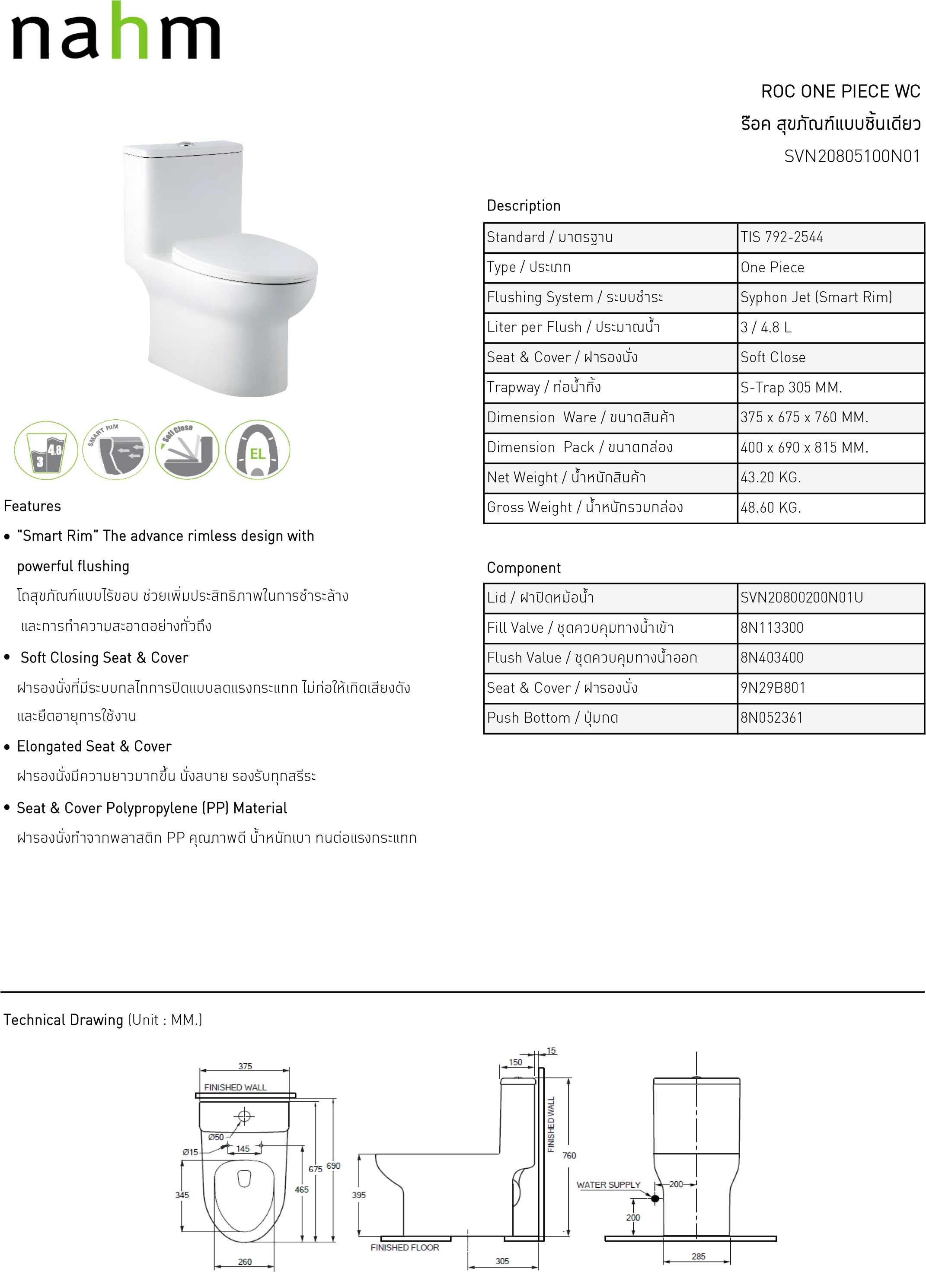 สุขภัณฑ์ชิ้นเดียว Nahm SVN20805100N01 รุ่นร็อค 3/4.8 ลิตร