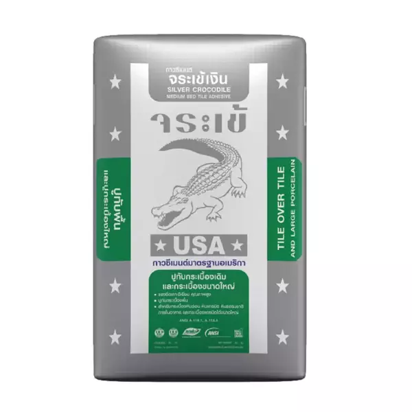กาวซีเมนต์จระเข้เงิน ประกอบด้วยปูนซีเมนต์ปอร์ตแลนด์, ทราย และวัสดุเคมีผสมเพิ่มชนิดพิเศษอื่นๆ ทำให้ผลิตภัณฑ์มีคุณสมบัติที่ให้การยึดเกาะสูงไม่ลื่นไหล สำหรับงานปูพื้น-ผนังโดยไม่ต้องใช้ตะขอยึด และสามารถปูทับพื้นเดิมสำหรับงานภายในอาคารได้