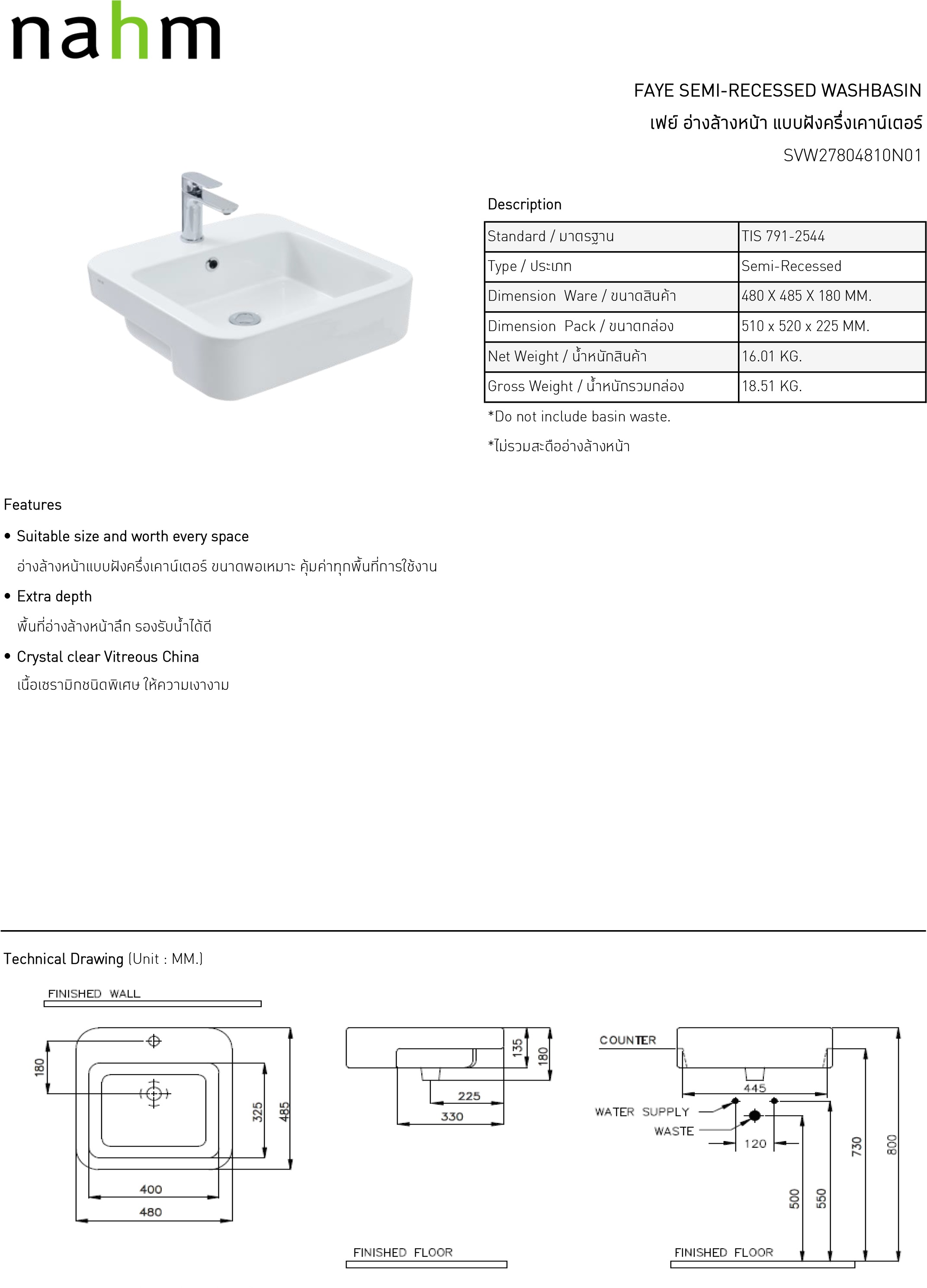 อ่างล้างหน้าแบบฝังครึ่งเคาน์เตอร์ Nahm SVW27804810N01 รุ่นเฟย์
