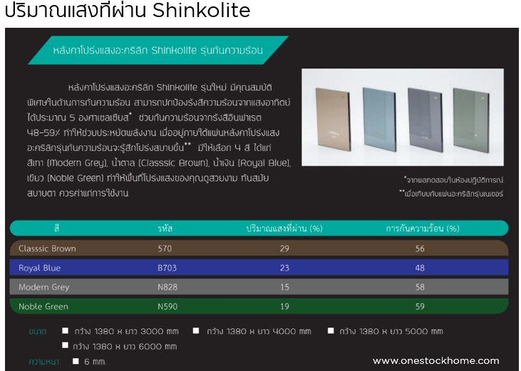 หลังคาโปร่งแสง ShinkoLite รุ่นกันความร้อน : สีน้ำเงิน หลังคาโปร่งแสงอะคริลิกเป็นอีกทางเลือกนึงของการเลือกใช้แผ่นโปร่งแสง Shinkolite มีคุณสมบัติพิเศษในด้านารกันความร้อน สามารถปกป้องรังสีความร้อนจากแสงอาทิตย์ได้ประมาณ 5...