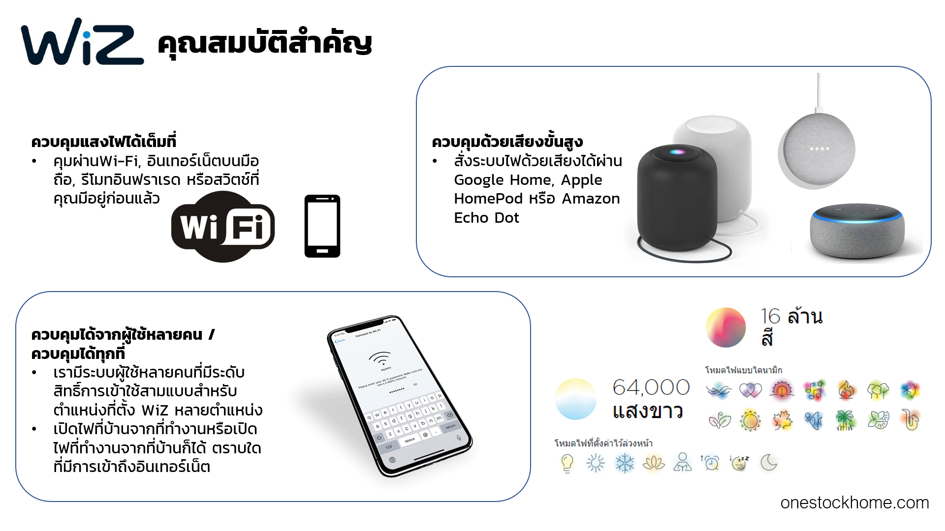 📷 คุณสมบัติสำคัญของ Wiz ควบคุมแสงไฟได้เต็มที่ •คุมผ่านWi-Fi, อินเทอร์เน็ตบนมือถือ, รีโมทอินฟราเรด หรือสวิตช์ที่คุณมีอยู่ก่อนแล้ว ควบคุมด้วยเสียงขั้นสูง •สั่งระบบไฟด้วยเสียงได้ผ่าน Google Home, Apple HomePod หรือ Amazon...