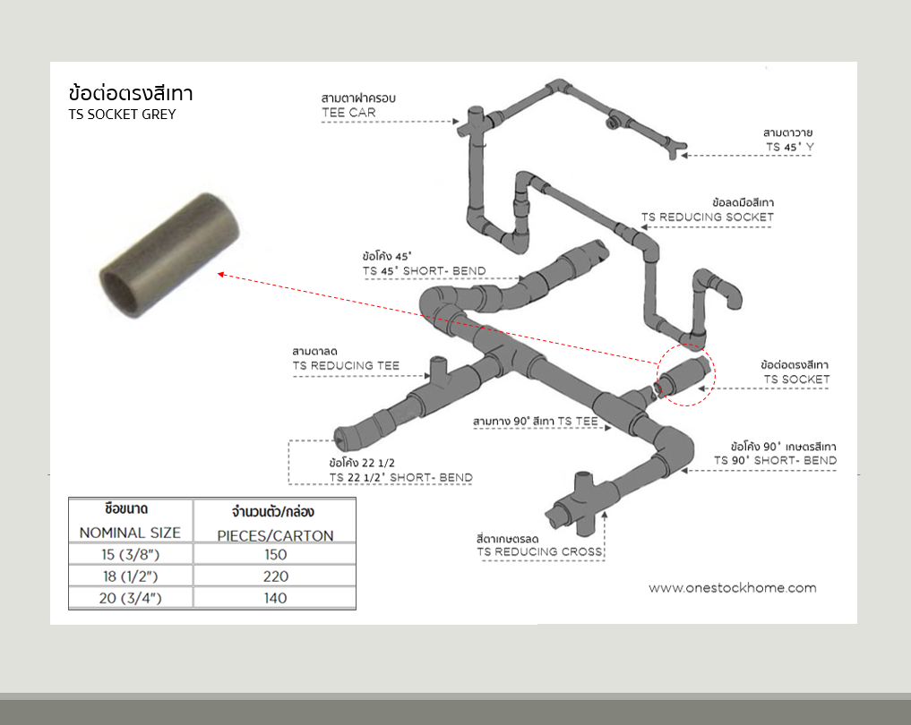 ข้อต่อตรง PVC สีเทา 3 หุน ท่อน้ำไทย