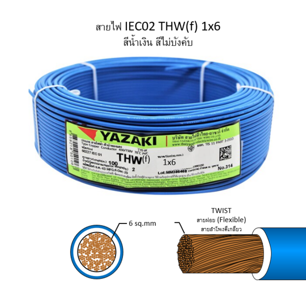 สายไฟ THW-F 1x6 ตร.มม. สีน้ำเงิน YAZAKI