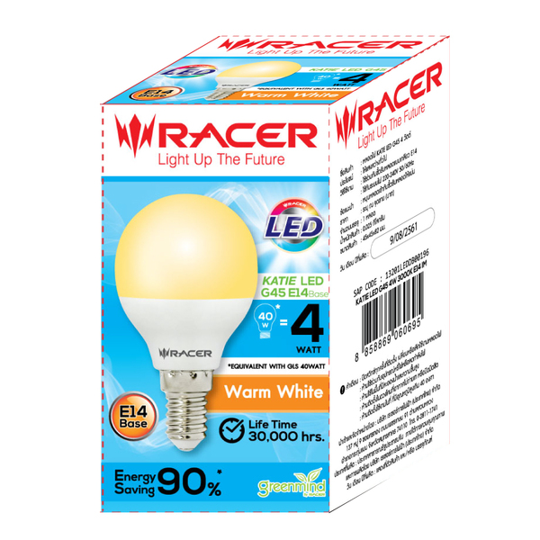 หลอดไฟ LED E14 4 วัตต์ วอร์มไวท์ ทรงปิงปอง RACER G45 KATIE