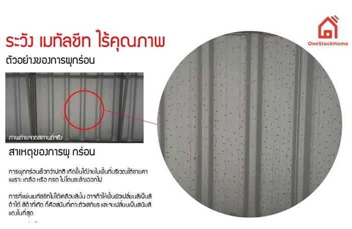 - ปกติมาตรฐานเมทัลชีททั่วไปเคลือบสีจริง 3 ชั้น และสีนั้น ต้องมี มอก. - เมทัลชีท เคลือบด้วยอลูซิงค์ ต้องเคลือบ AZ 150 ถ้าเคลือบด้วย AZ 70-100 (ต่ำ) จะไม่ทนต่อสนิม- สีอลูซิงค์จะเป็นสีที่อมความร้อนมาก แต่เมทัลชีทที่เคลือบด้วยสี จะอมความร้อนน้อยกว่า