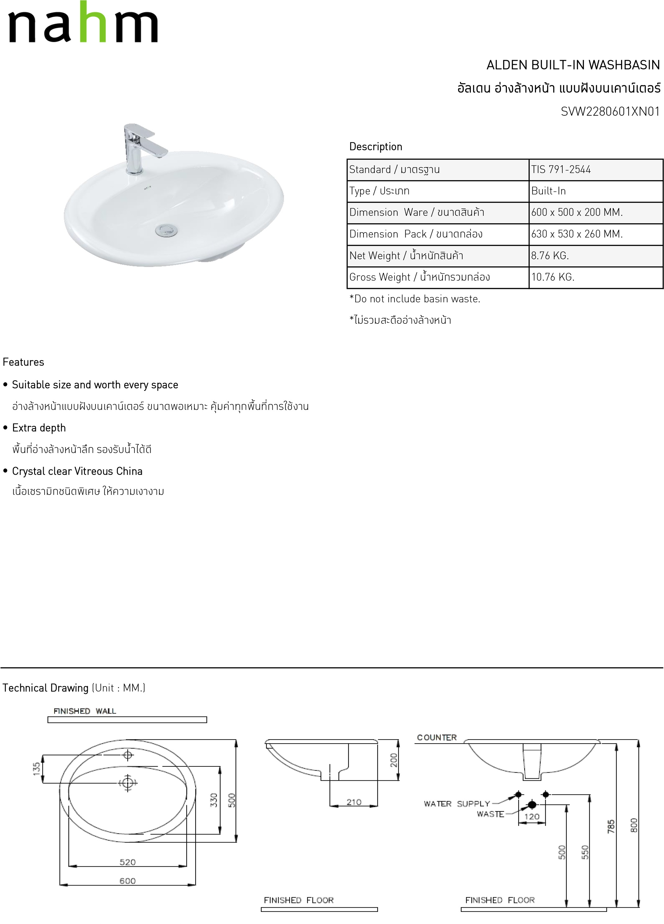 อ่างล้างหน้าแบบฝังบนเคาน์เตอร์ Nahm SVW2280601XN01 รุ่นเอเดน