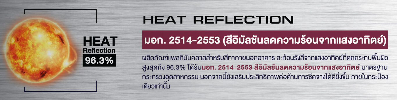 1. เทคโนโลยีสะท้อนความร้อนอัจฉริยะ ที่สามารถสะท้อนทุกคลื่นความร้อนทำให้บ้านเย็น จากส่วนผสมของอนุภาคฉนวนไมโครสเฟียร์เซรามิก เทคโนโลยีแม่สีสะท้อนความร้อน ผสานกับคุณสมบัติพิเศษจากอลูมิเนียมเพสต์ ทำให้ช่วยลดอุณหภูมิในบ้านให้ต่ำลง 3-5 องศาเซลเซียส ช่วยให้คุณประหยัดไฟ ได้ถึง 3 เท่า ทำให้คุณรู้สึกผ่อนคลายจากความร้อน และรู้สึกสบายเมื่อจ่ายค่าไฟ