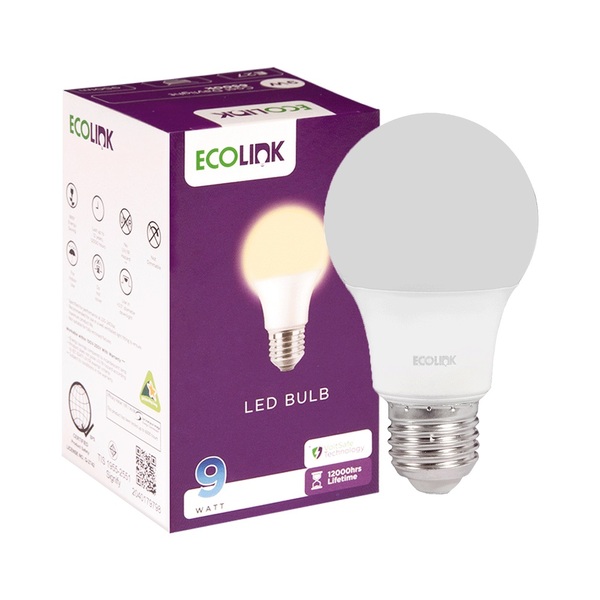 หลอดไฟ LED E27 9 วัตต์ วอร์มไวท์ ทรงลูกแพร์ ECOLINK A60