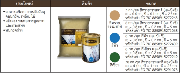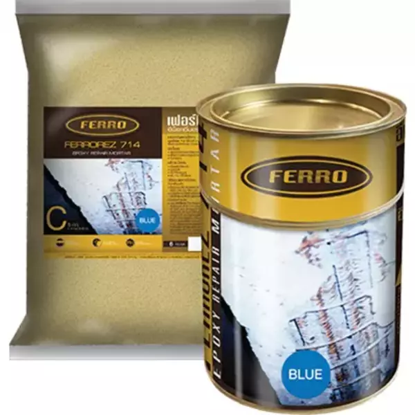 เฟอร์โรเรซ 714 อีพ็อกซี่ 3 องค์ประกอบ ชนิดไม่มีส่วนผสมของสารทำละลาย มีความ แข็งแรงสูง เหมาะสำหรับฉาบซ่อมรอยแตกบิ่นของหัวเสาเข็มและโครงสร้างคอนกรีต ทั่วไป