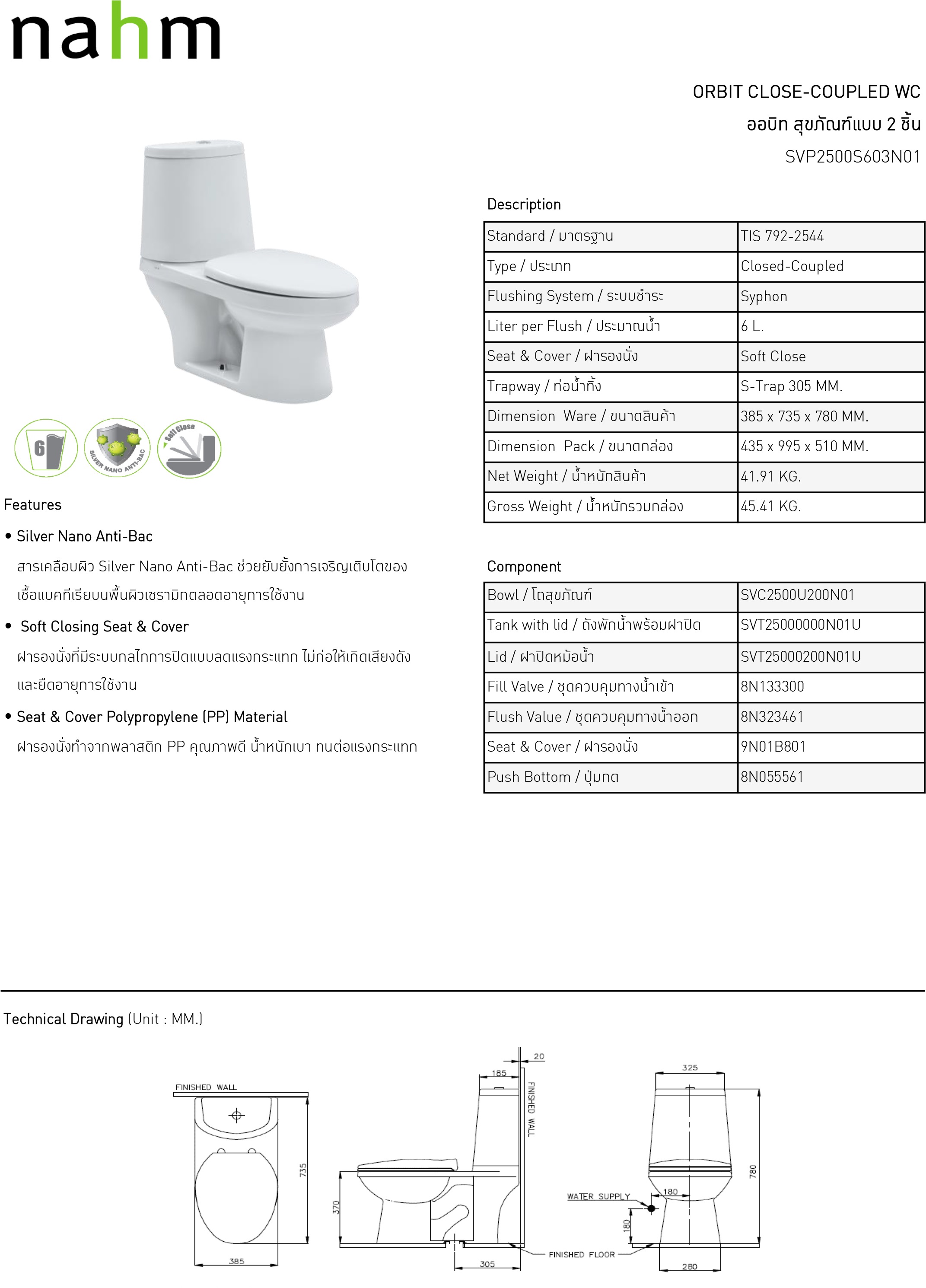 สุขภัณฑ์สองชิ้น Nahm SVP2500S603N01 รุ่นออบิท 6 ลิตร ฝาปิด Soft Close