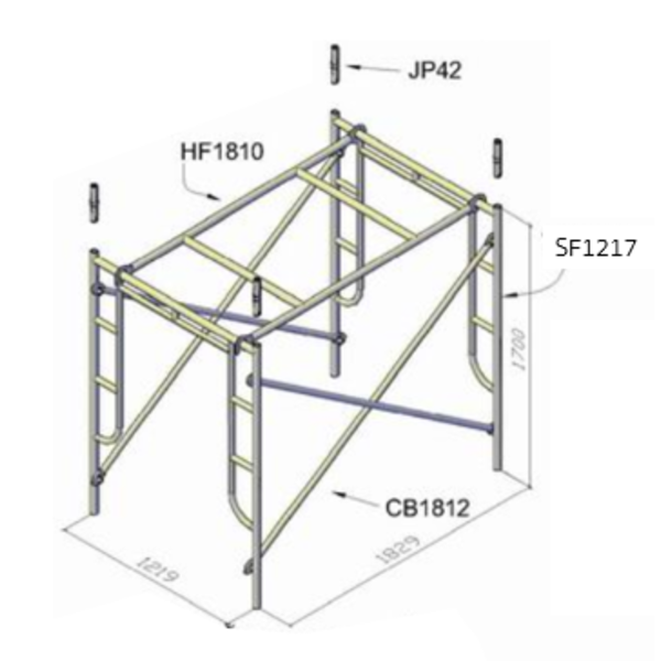นั่งร้าน ชุด 9 ชิ้น จำนวน 1 ชุด ประกอบไปด้วย: ขาตั้งนั่งร้าน 2 ชิ้น ขนาด 1219x1700 มม. ฝาครอบ 1 ชิ้น ขนาด 1050x1829 มม. กากบาท 2 ชิ้น ขนาด 1829x1219 มม. ข้อต่อ 4 ชิ้น ขนาด 35x225