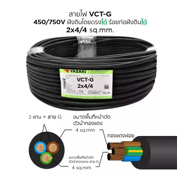 สายไฟ VCT-G 2x4/4 ตร.มม. YAZAKI เป็นสายไฟฟ้าชนิดตัวนำทองแดงฝอยตีเกลียวที่มีความอ่อนตัวสูง หุ้มด้วยฉนวนและเปลือกนอก PVC คุณภาพดีจากแบรนด์ Yazaki (ยาซากิ) ที่ได้รับการยอมรับในอุตสาหกรรม สายไฟประเภท VCT-G นี้ออกแบบมาเป็นพิเศษสำหรับงานที่ต้องการสายดิน (Ground) ในตัว เพื่อเพิ่มความปลอดภัยในการใช้งาน สายไฟ VCT-G 2x4/4 ตร.มม. YAZAKI มีคุณสมบัติเด่นคือความทนทานต่อสภาพแวดล้อม การกัดกร่อน และแรงกระแทก ทำให้เหมาะสำหรับการใช้งานทั้งภายในและภายนอกอาคาร รวมถึงการติดตั้งแบบฝังดินโดยตรงหรือร้อยท่อฝังดินตามมาตรฐานการติดตั้งระบบไฟฟ้าของประเทศไทย